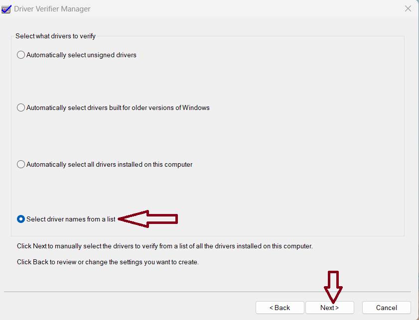 1. Open de Run-prompt. Typ “verifier” en druk op de Enter-toets om het venster Driver Verifier Manager te openen.