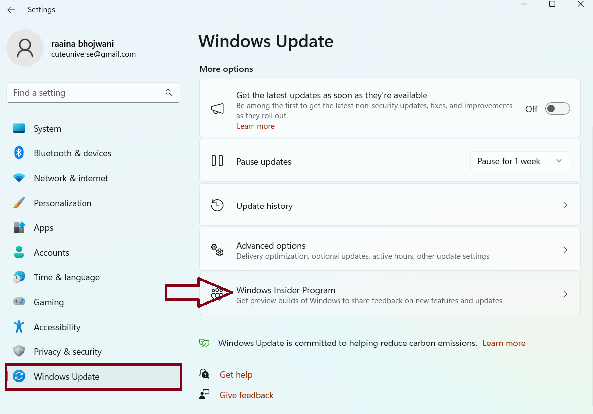 2. Klik op “Windows Update” > “Windows Insider-programma”.