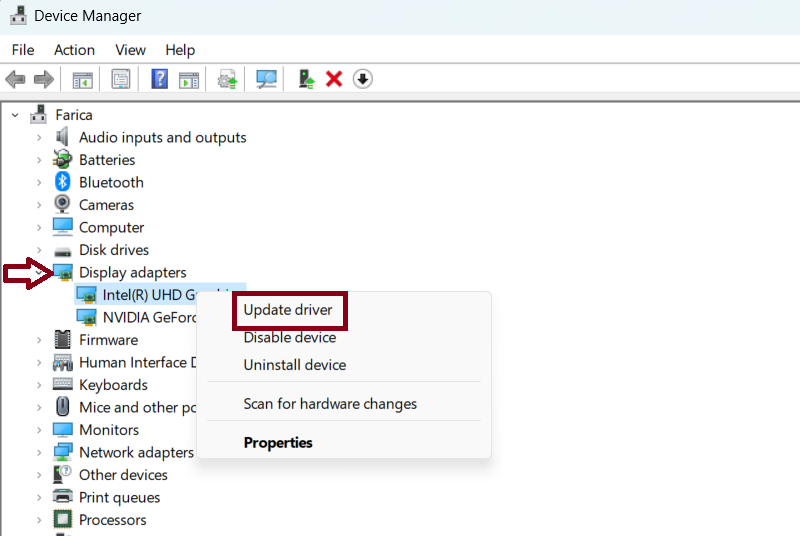 3. Klik met de rechtermuisknop op het beeldscherm/grafische stuurprogramma en kies “Stuurprogramma bijwerken”.