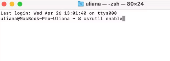 Stap 6:Zodra uw Mac opnieuw is opgestart, moet SIP worden uitgeschakeld. U kunt de status ervan verifiëren door Terminal te openen en de opdracht in te voeren: csrutil enable