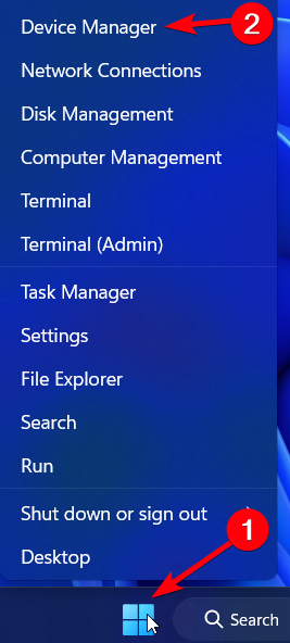 - Klik met de rechtermuisknop op de Windows-taakbalkknop en selecteerApparaatbeheer.