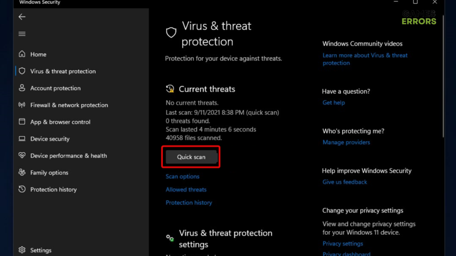 4. Scroll naar beneden tot je deHuidige bedreigingenoptie en kies er vervolgens voor om een ​​Snelle scan uit te voeren.
