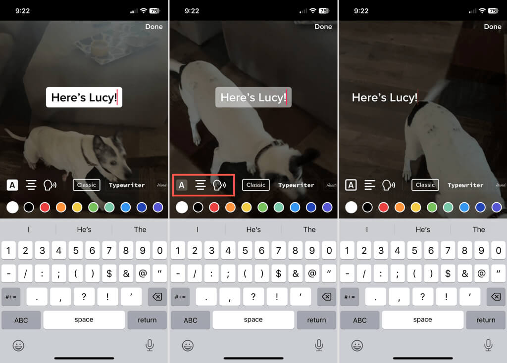 - Je ziet dan de aanpassingsopties samen met je toetsenbord. Typ de tekst die u wilt toevoegen, zodat u een voorbeeld kunt bekijken van de aanpassingen die u kiest. De tekst verschijnt als een overlay op uw video.