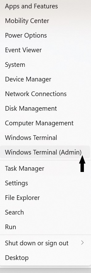 1. Begin door met de rechtermuisknop op te klikkenBeginop de taakbalk en selecteerWindows-terminal (beheerder).