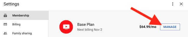 5. SelecteerBeheer lidmaatschap. Dit zou direct naast het pictogram van je YouTube TV-abonnement moeten staan.