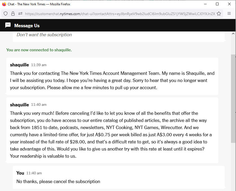 De tweede manier waarop abonnees hun abonnement kunnen opzeggen, is door de chatknop van de NY Times-website te gebruiken. Dit is de gemakkelijkste manier om je af te melden voor de meeste apparaten, inclusief je pc, Android-telefoon of iPhone. Helaas stuurt de app van The New York Times je door dezelfde hoepels.
