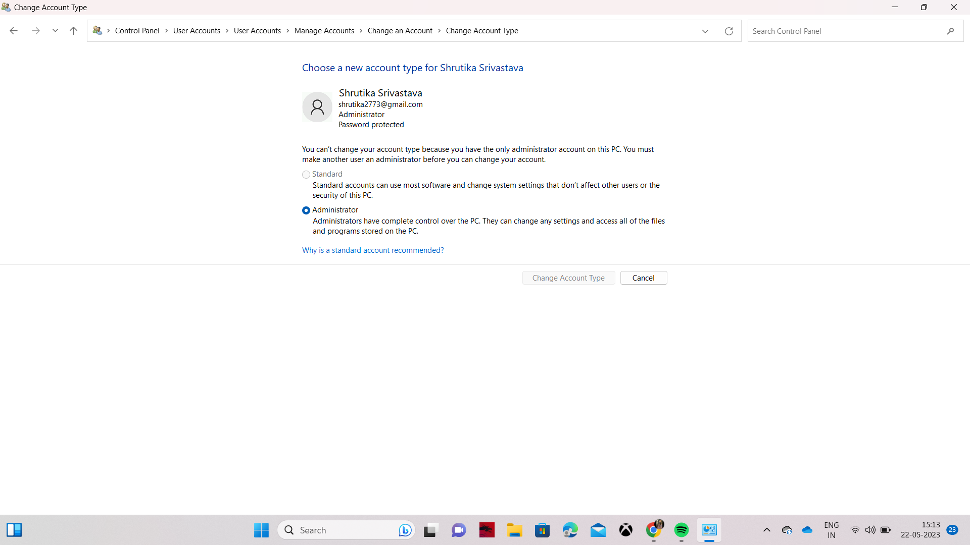 - Selecteer “Beheerder” en klik op de knop “Accounttype wijzigen”.