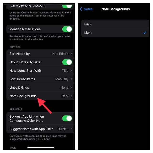 Voor een naadloze ervaring verandert de Apple Notes-app automatisch de achtergrondkleur afhankelijk van het uiterlijk van het systeem. Als u bijvoorbeeld de donkere modus op uw iPhone hebt ingeschakeld, heeft de app voor het maken van aandelennotities een donkere achtergrond. En als je voor de lichtmodus hebt gekozen, is de achtergrondkleur van de notities-app licht.