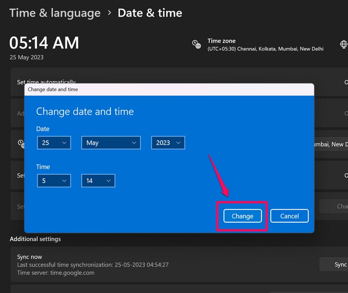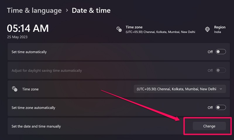 5.Klik nu eenvoudig op deWijzigingknop naast deStel de datum en tijd handmatig inoptie om de gebruikersinterface Datum en tijd wijzigen in Windows 11 te openen.