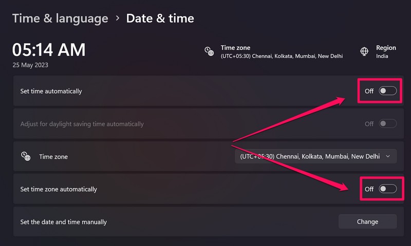 Houd er echter rekening mee dat het inschakelen van de bovenstaande schakelaars op de pagina Datum- en tijdinstellingen in Windows 11 dat wel zal doenvergrendel de optie Datum en tijd handmatig instellen.