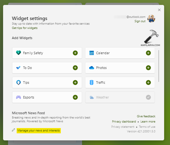 2.Klik in Widgetinstellingen opBeheer uw nieuws en interesseslink in de linkerbenedenhoek.