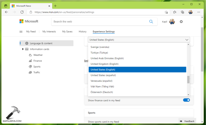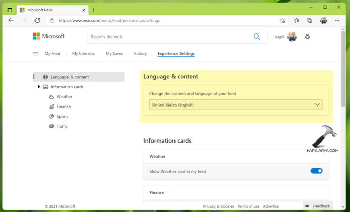 3.Hierdoor wordt uw standaardbrowser geopend en wordt de Microsoft Nieuws-pagina geladen. Ga op die pagina naarErvaring instellingentabblad. Op dat tabblad, onderTaal en inhoud, kunt u de inhoud en de taal van uw feedback wijzigen.