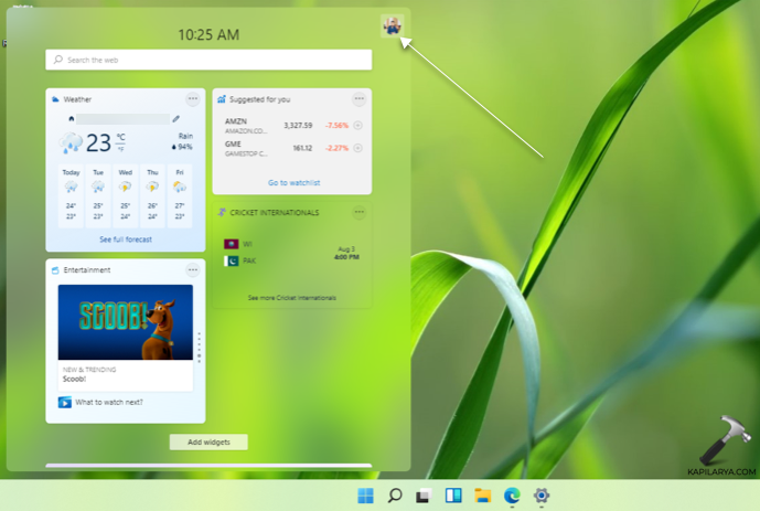 + Wtoetsen op uw systeem om Widgets te openen. U kunt ook op de Widget-knop op de taakbalk klikken. Klik op uw profielfotopictogram bovenaan het Widgets-scherm (zie onderstaande schermafbeelding).