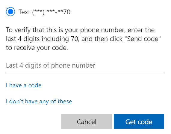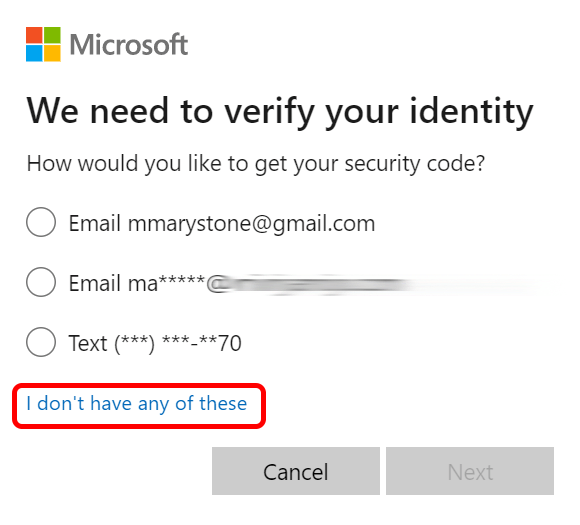 - Selecteer de identiteitsverificatiemethode van uw voorkeur. Als u geen verificatieopties ziet of geen toegang heeft tot de aangeboden opties, kunt u uw wachtwoord niet opnieuw instellen met deze methode. Selecteer in dat gevalIk heb geen van dezeen volg de instructies om het accountherstelproces te starten.