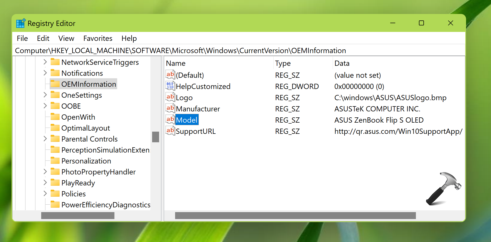 Opmerking:Als u het niet kunt vindenHKEY_LOCAL_MACHINESOFTWAREMicrosoftWindowsCurrentVersionOEMInformation, dan kun je in plaats daarvan naar gaanHKEY_LOCAL_MACHINESYSTEMCurrentControlSetControlSystemInformationen wijzigenSystemProductNamemet de gewenste tekst van uw apparaatmodelnaam.
