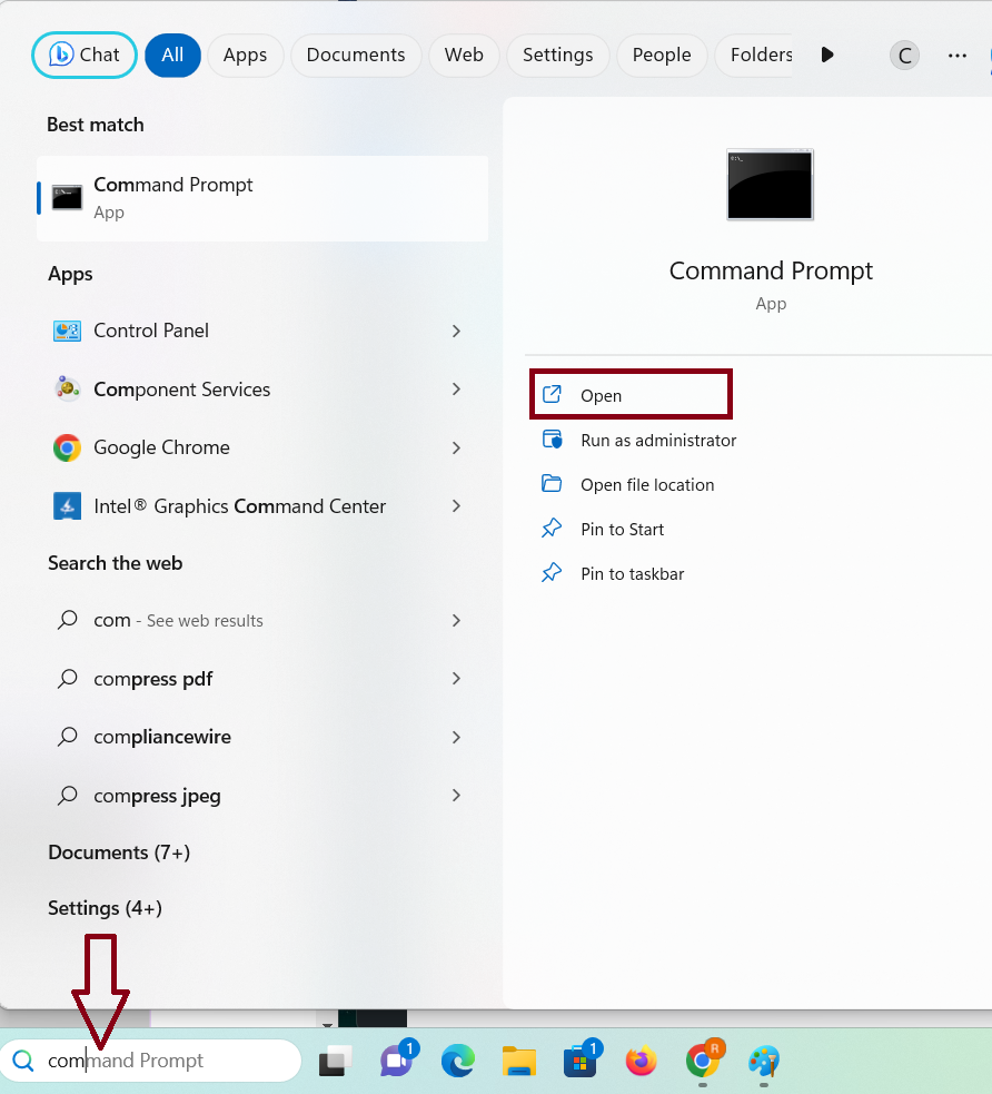 7. Zoek in de opdrachtprompt in de zoekbalk en klik op 'Openen'.