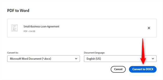 - Na het uploaden ziet u een scherm waarin u de documenttaal en het documenttype waarnaar u de PDF wilt converteren, kunt bevestigen. KlikConverteren naar DOCX.