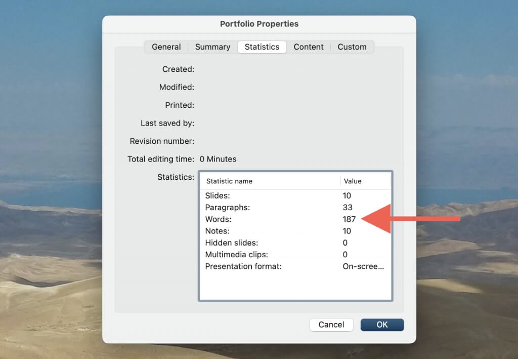 - SelecteerToon alle eigenschappen(Windows) ofStatistieken(macOS). Je zou het aantal woorden van de presentatie ernaast moeten zienWoorden.