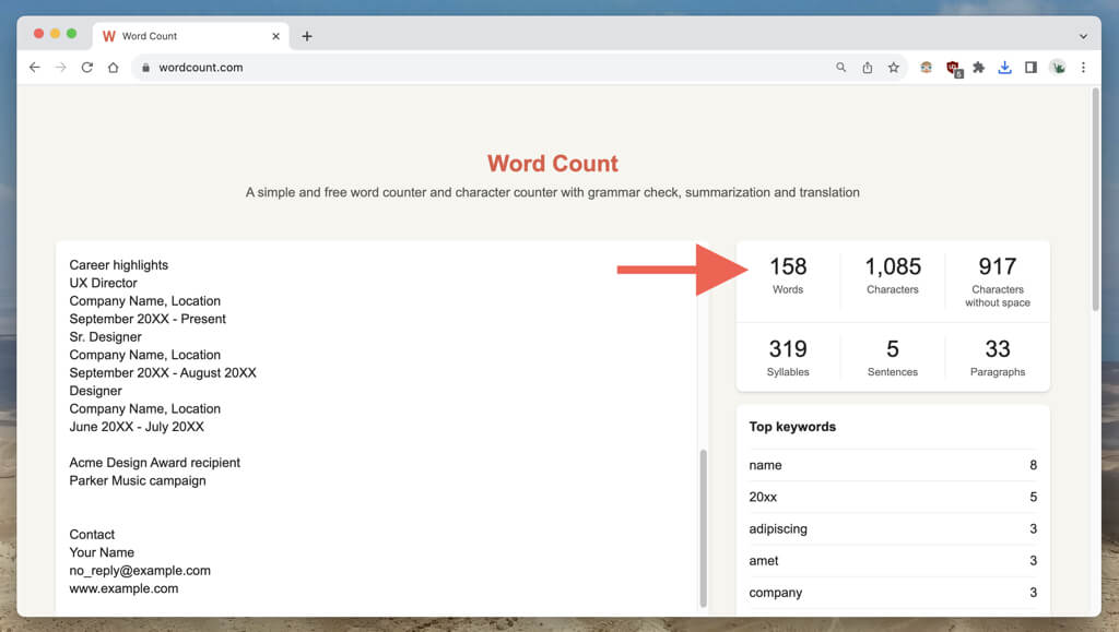 - Plak de inhoud in een tekstverwerker zoals Microsoft Word (je zou het aantal woorden linksonder in het scherm moeten zien) of Google Documenten (selecteerHulpmiddelen>Aantal woordenop de menubalk). Een veel eenvoudiger alternatief is echter om alles naar een site alsAantal woorden.
