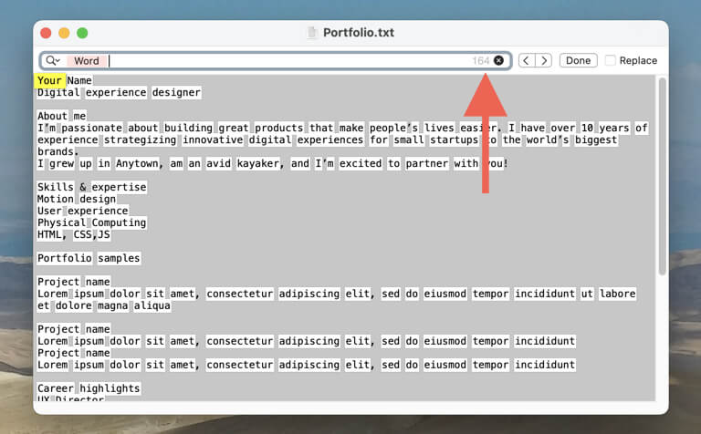 Open gewoon het .TXT-bestand in Teksteditor en druk opCmd+F(of selecteerBewerking>Vindenop de menubalk) om de zoekfunctie te openen. Selecteer vervolgens deZoekopdrachtpictogram in de linkerhoek van deZoekopdrachtveld en kiesPatroon invoegen>Alle woordtekens. Het aantal woorden zou in de rechterhoek van het scherm moeten verschijnenZoekopdrachtveld.