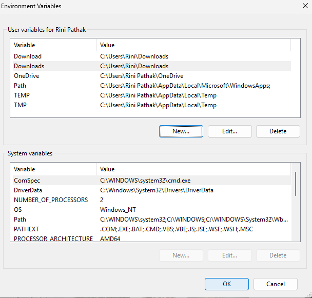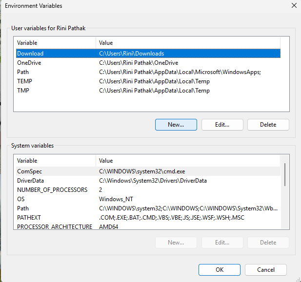 Stap 3-Selecteer nu onder de bovenste sectie Gebruikersvariabelen <huidige gebruikersnaam> de optie Nieuwe.