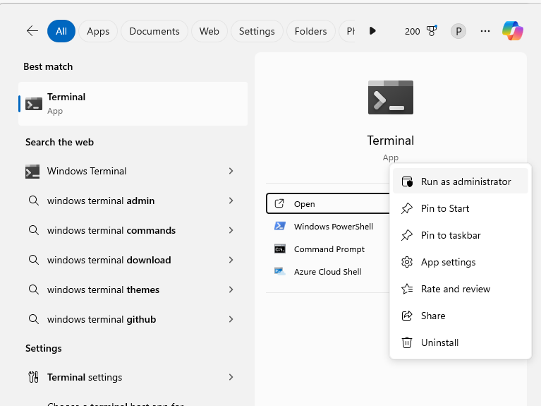 Stap 1-Ga eerst naar Windows Terminal en voer het uit als beheerder.