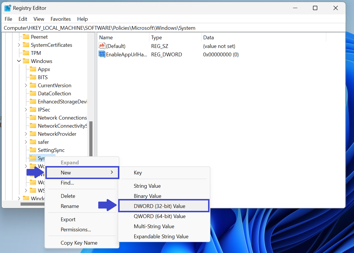 Klik met de rechtermuisknop op Systeem => Nieuw => DWORD-waarde (32-bit). Typ 'EnableAppUrlHandlers' en klik op OK.
