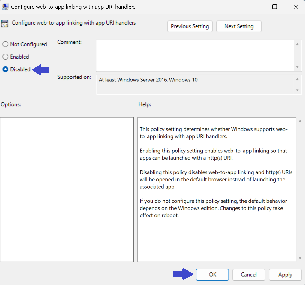 5. Als u de apps voor websites wilt uitschakelen, selecteert u Uitgeschakeld om uit te schakelen. Klik op OK en Toepassen.