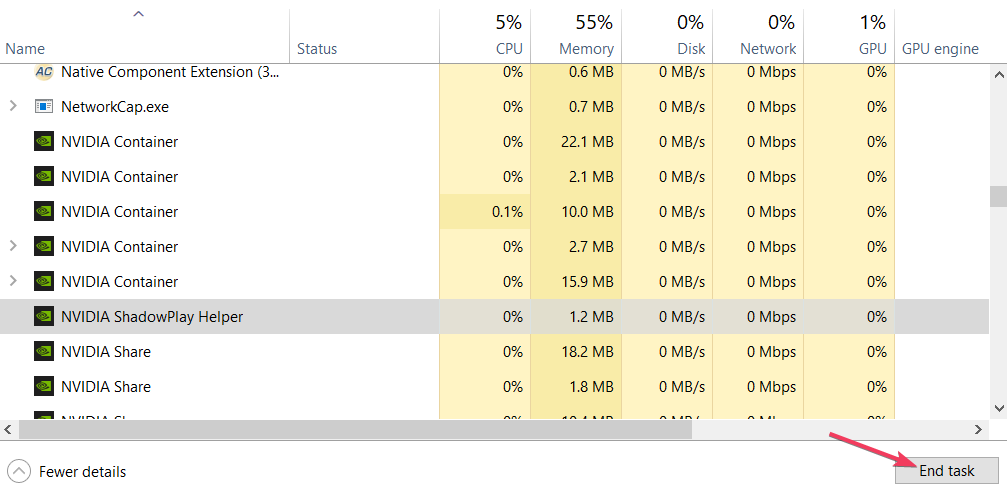 2. Zoek en selecteer eenNVIDIA ShadowPlay-helperproces binnen deProcessentabblad.