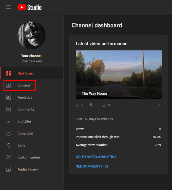 - Ga naar YouTube Studio. Je kunt dit doen door op je YouTube-profielafbeelding te klikken, of via dedirecte link.