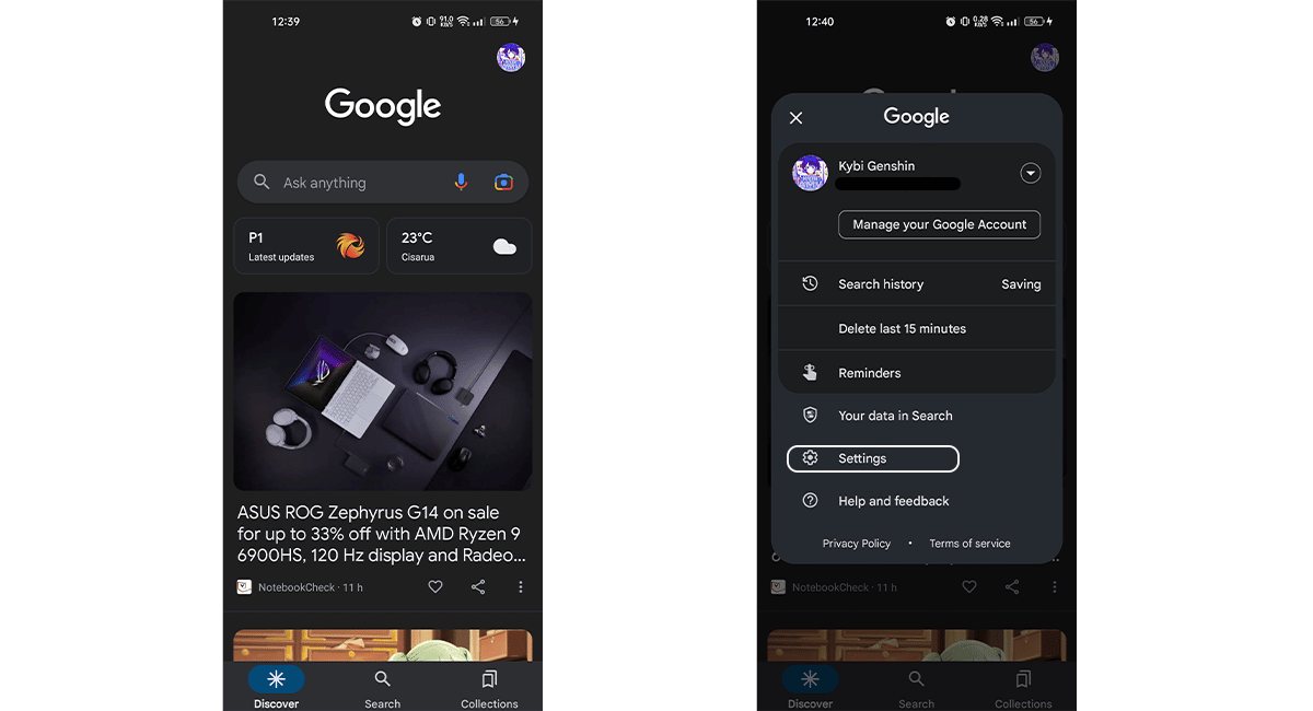 - Open de Google-app> klik op het pictogram rechtsboven> klik op instellingen.