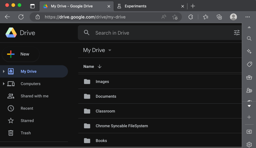 Het standaard donkere thema van Microsoft Edge werkt niet met Google Drive, maar de experimentele donkere modus wel.