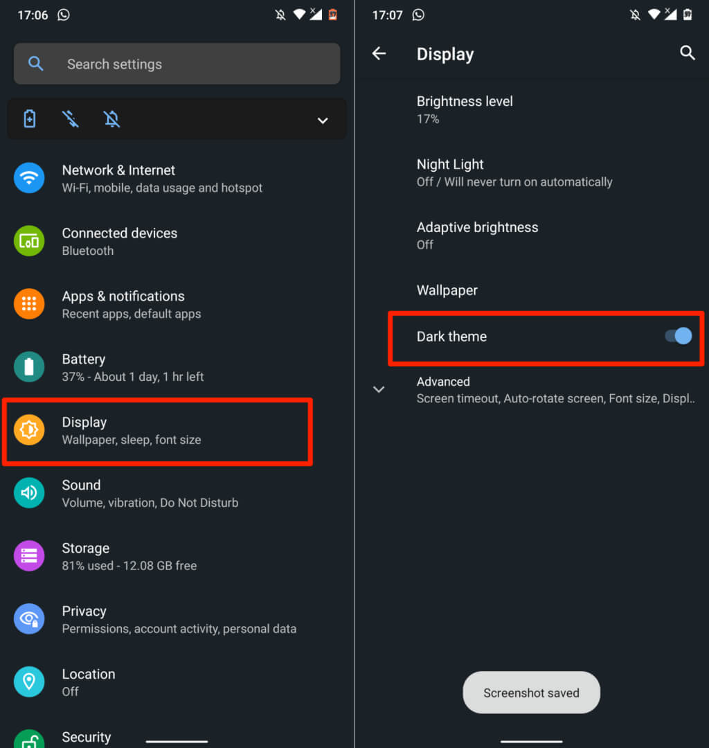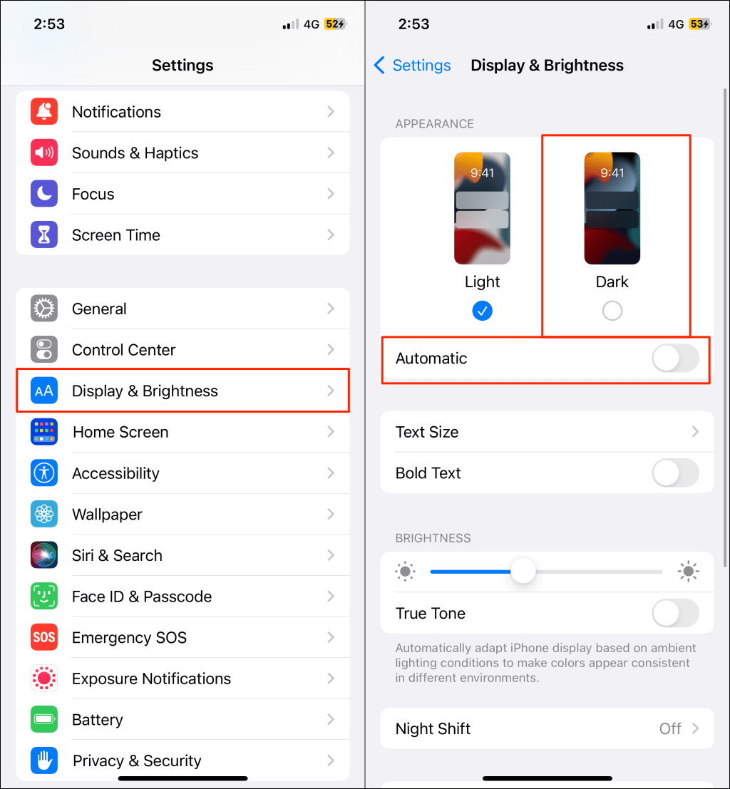 Open deInstellingenapp, tikWeergave(ofWeergave en helderheid), en schakel inDonker thema(ofDonkere modus).