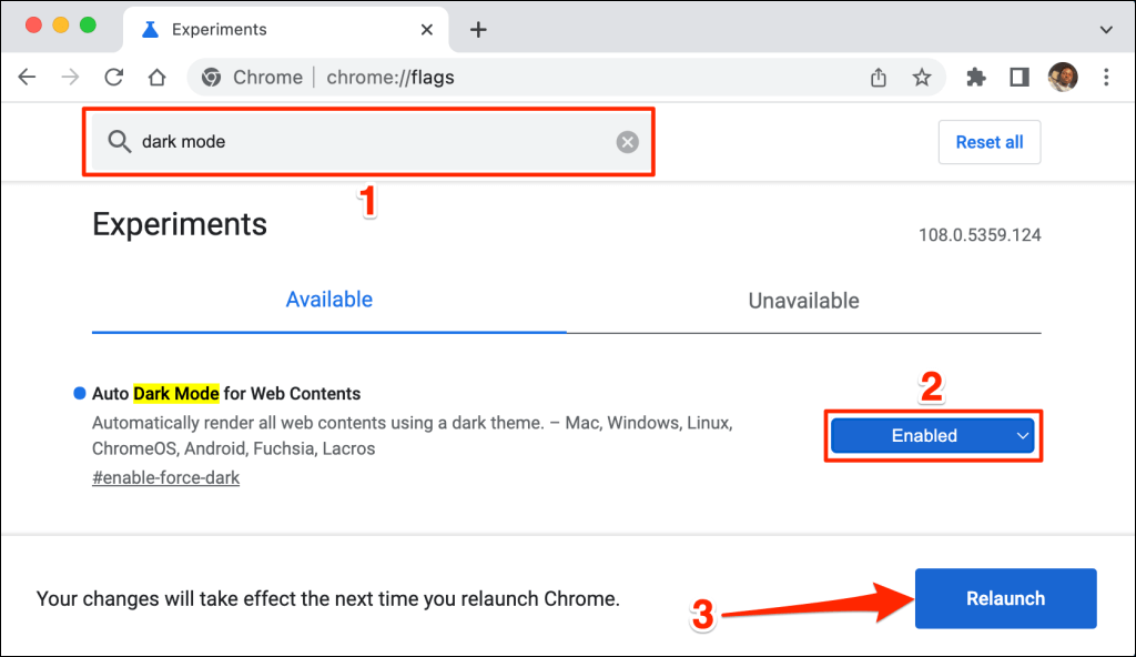 - KiezenIngeschakeldin het vervolgkeuzemenu om de experimentele donkere modus van Chrome te activeren.