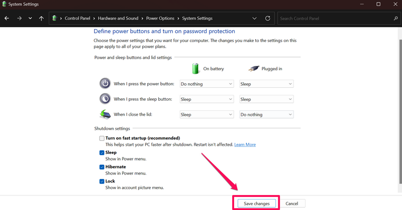 8.Als u de functie Snel opstarten later op uw apparaat wilt inschakelen, volgt u eenvoudigweg de bovenstaande stappen envink het vakje aan voor Snel opstarten inschakelenonder het gedeelte Afsluitinstellingen en sla de wijzigingen op.