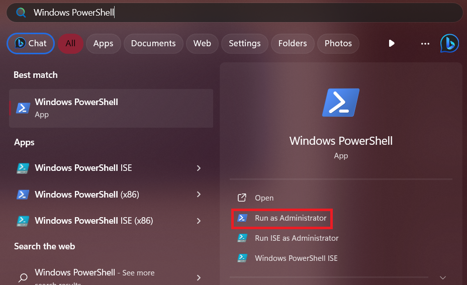 1.Open het Startmenu, zoek naarWindows PowerShellen selecteerUitvoeren als beheerder.