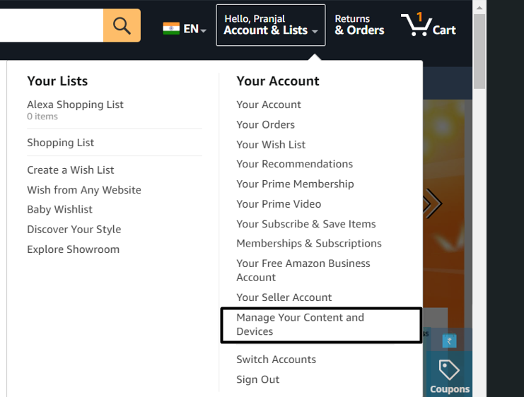 2.Selecteer deUw Prime-lidmaatschapoptie uit deAccount & Lijsten’vervolgkeuzemenu.