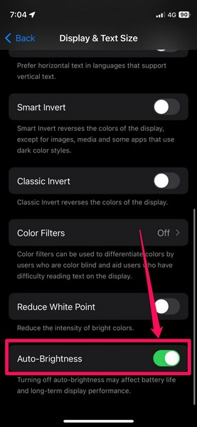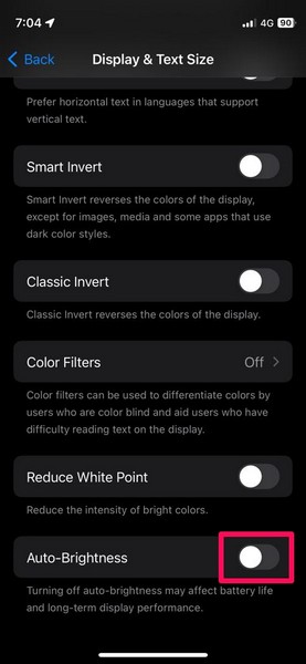 4.Blader nu naar beneden om deAutomatische helderheidoptie en tik op de schakelaar ernaast om de functie op uw iPhone uit te schakelen.