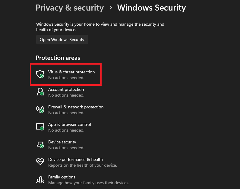In sommige gevallen kan het virus- en bedreigingsbeveiligingsprogramma van Windows 11 het bestand update.exe van Discord ten onrechte als schadelijk markeren, waardoor ze geen updates kunnen starten en downloaden/installeren. Door de realtime beveiligingsinstellingen tijdelijk uit te schakelen, kunt u controleren of dit het probleem veroorzaakt en vervolgens passende actie ondernemen.