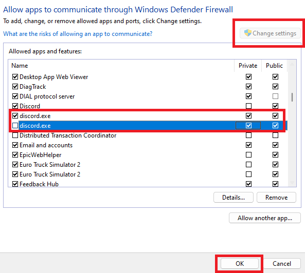 4.Klik op deInstellingen wijzigenknop, selecteer het netwerk voor Discord en klik op deOKknop.