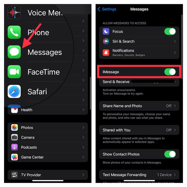 Navigeer naar deInstellingen-appop uw iPhone of iPad-> Berichten. Schakel nu de schakelaar uit vooriBericht. Start daarna uw apparaat opnieuw op.