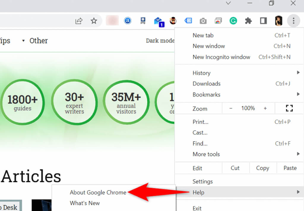 - LaunchChroom, selecteer de drie stippen in de rechterbovenhoek en kiesHulp>Over Google Chrome.