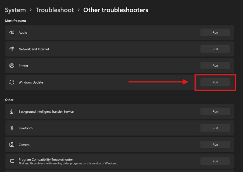 4.Zoek op de volgende pagina deWindows-updateoptie en klik op deKnop Uitvoerenernaast om het proces te starten.