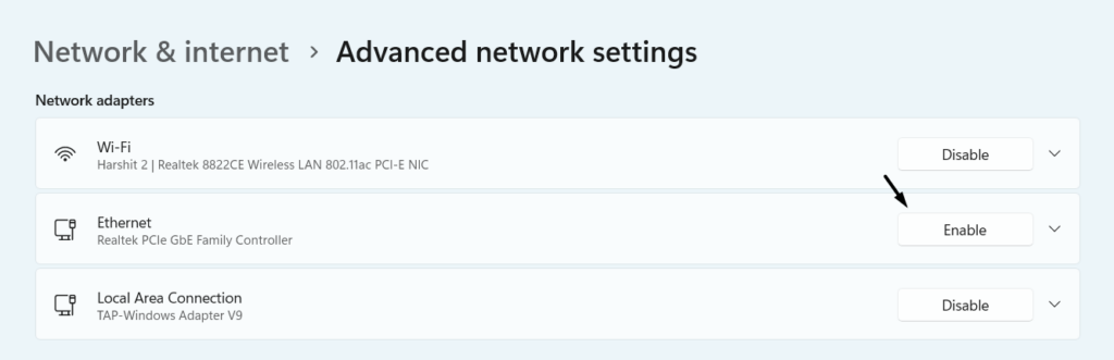 Open Instellingen > Netwerk en internet > Geavanceerde netwerkinstellingen > klik op de knop Inschakelen naast Ethernet