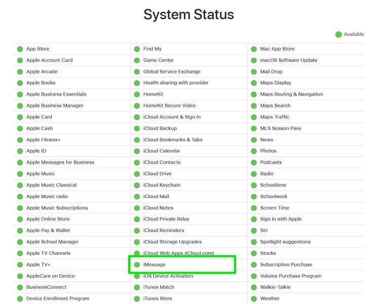 Dus als geen van de bovengenoemde methoden u heeft geholpen het probleem met het spraakbericht op uw iPhone op te lossen, ga dan naar de officiële systeemstatuspagina van Apple om te controleren of iMessage niet werkt. Als de cirkel naast iMessage in uw regio een andere kleur heeft dan groen, betekent dit dat de server momenteel problemen ondervindt.