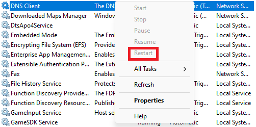 3.Kies in het rechtermuisknopmenuOpnieuw opstarten of vernieuwenom de DNS Client-service te vernieuwen.