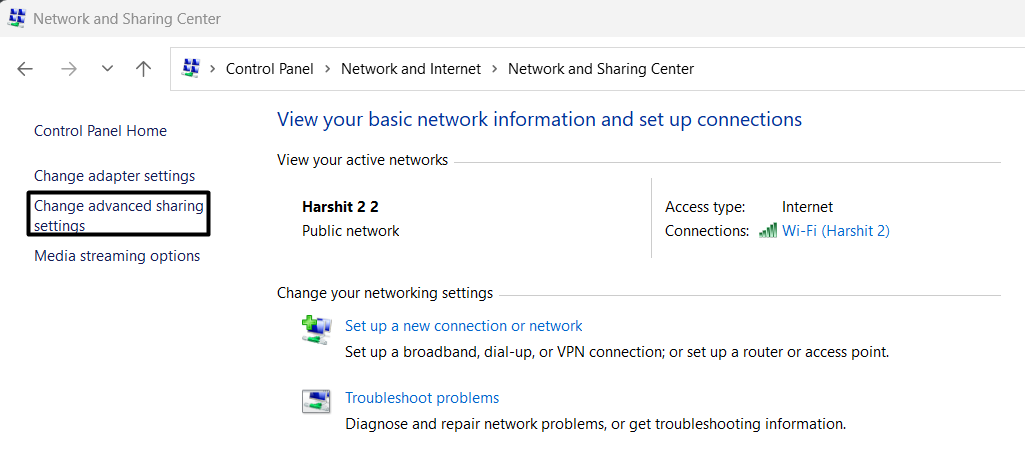 3.Kies op het volgende scherm deWijzig geavanceerde instellingen voor delenknop in het linkerdeelvenster.
