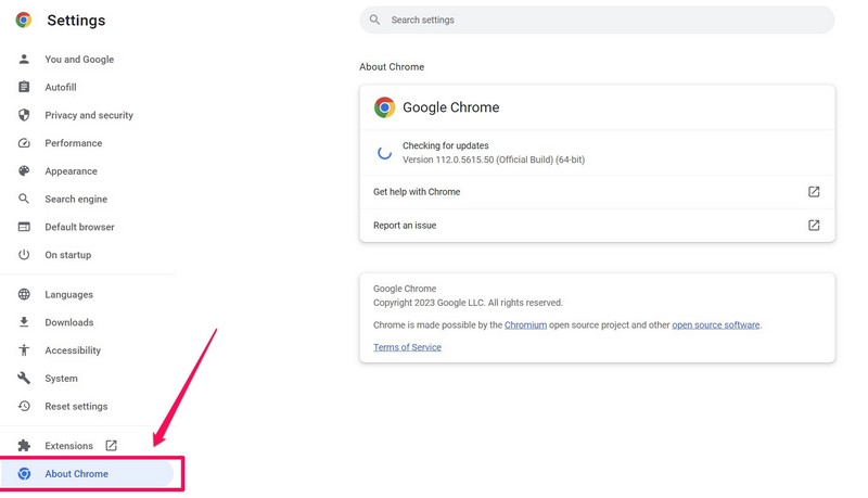 3.Ga op het tabblad Instellingen naar deOver Chroomtabblad in de linkernavigatiebalk.