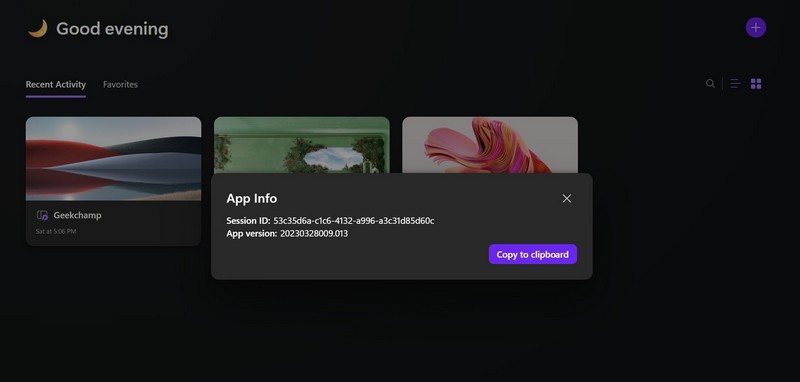 Als u de PWA-versie van Loop op uw apparaat gebruikt, kunt u deze op uw pc starten, op de knop met drie stippen klikken om naar het gedeelte Over te gaan en de sessie-ID en app-versie kopiëren om meer details aan uw feedbackrapport toe te voegen.