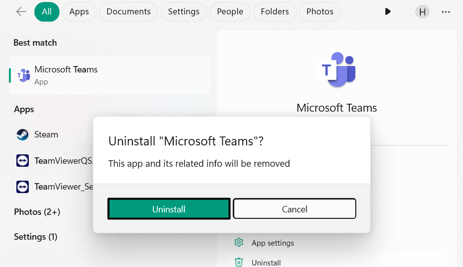 1.Open deWindows-zoekvakop uw pc typt uMicrosoft Teamsdaarin en klikVerwijderen.